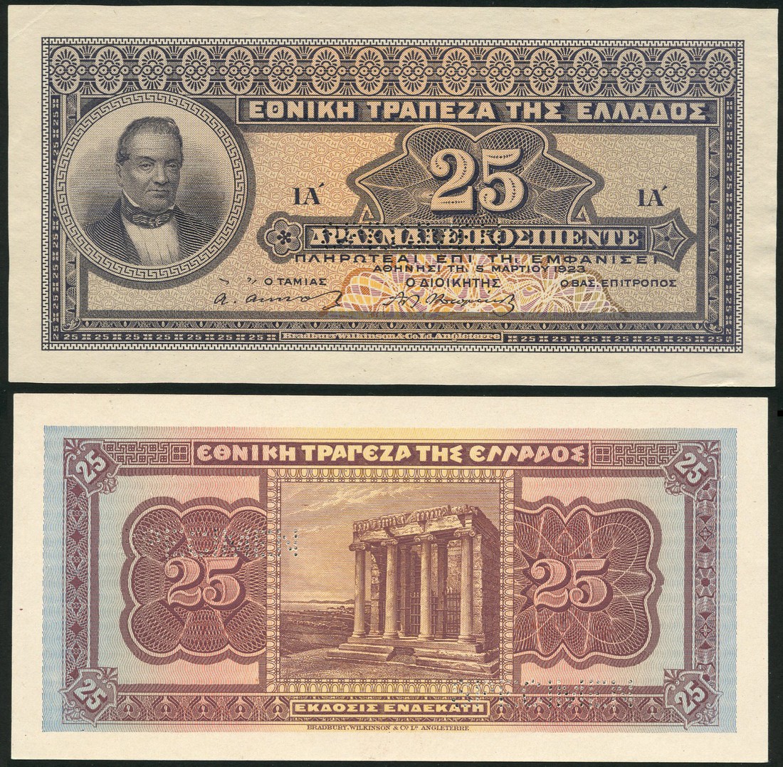 (†) National Bank of Greece, obverse and reverse specimen colour trial 25 Drachmai, 5 March 1923, no serial numbers, slate-violet on pink and grey underprint, portrait of G. Stavros at left, value in guilloche at centre, reverse purple on pink and pale blue underprint, temple at centre, value at right and left, perforated SPECIMEN