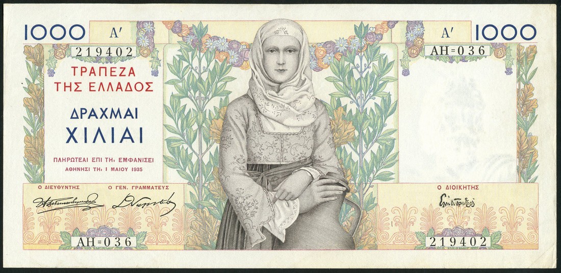 Bank of Greece, 50, 100, 1000 Drachmai, all 1935, and 1000 Drachmai, 1956, an extremely pleasant group, retaining vibrant colour