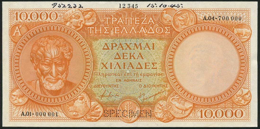 (†) Bank of Greece, printer's archival specimen 10,000 Drachmai, ND (1945), serial number run A.01-000001 to A.04-700000, orange on pale green underprint, Aristotle at left, ancient coins at upper and lower centre, reverse brown, standing male figure at centre, horses and chariots in lower frieze, ornate patterned circle at right, perforated SPECIMEN