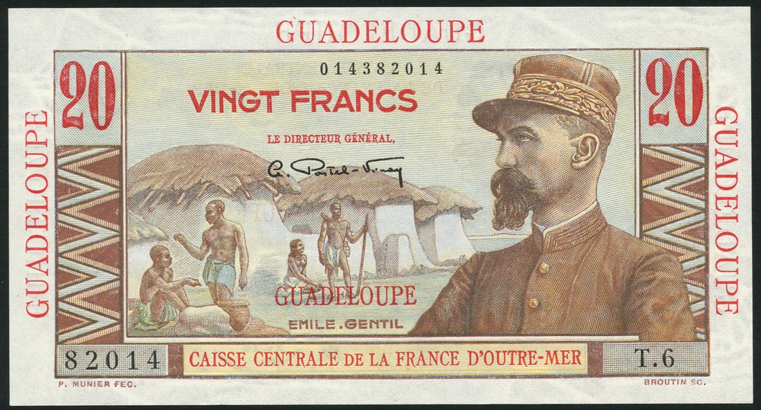 Caisse Centrale de la France d'Outre Mer, Guadeloupe, 10 francs, ND (1947-49), serial number 29029, 20 francs ND (1947-49), serial number 82014, blue on multicolour and brown on multicolour