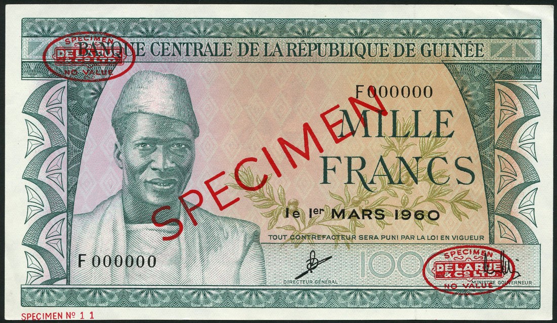 (†) Banque Centrale de la Republique de Guinea, specimen 1000 Francs (2), 1 March 1960, serial numbers A000000 and F000000, green on multicoloured underprint, President Sekou Toure at left, reverse banana harvesting; and specimen 5000 Francs, 1 March 1960, serial number A000000, purple and green on multicoloured underprint, President Sekou Toure at left, reverse woman in headdress at left, huts at right, all overprinted SPECIMEN in red with two De La Rue specimen ovals on obverse and reverse, two copies with one punch hole