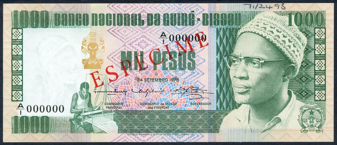 (†) Banco National da Guinea Bissau, obverse composite essay on card for a 20 Pesos, ND (c1976), serial number A123456, dark blue and pale blue on pink and blue underprint, buffalo at centre left, ornate frieze at centre right and lower centre, portrait of Amilcar Cabral with head cut out at right; also obverse and reverse specimen proofs 1000 Pesos, 24 September 1978, serial number A/1 000000, green and multicoloured, Amilcar Cabral at right, man weaving at lower left, reverse brown on green underprint, allegory