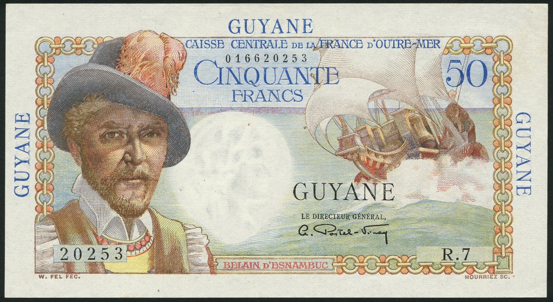 Caisse Centrale de la France d'Outre-Mer, Guyane 50 Francs, ND (1947-49), serial number 20253 R.7, brightly coloured, portrait at right and sailing ship at left, reverse woman at left, overprint GUYANE