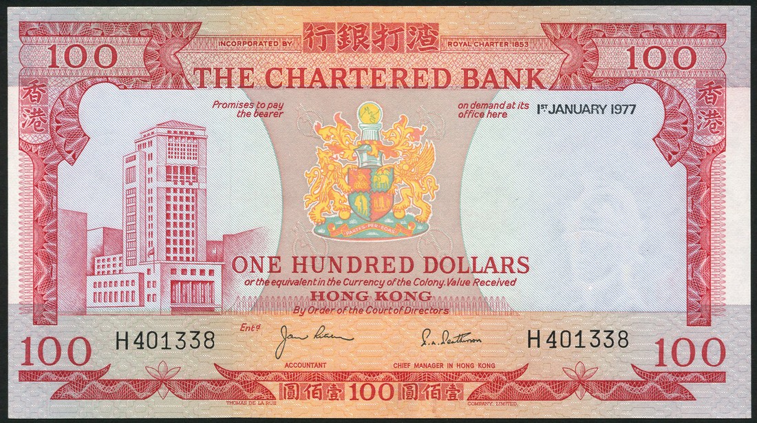 Chartered Bank, Hong Kong, $100, 1 January 1977, serial number H401338, red on multicolour underprint, bank building at right, bank crest at centre, also Government of Hong Kong $1, 1 July 1954, serial number ID 515795, green on multicolour, Queen Elizabeth II at right