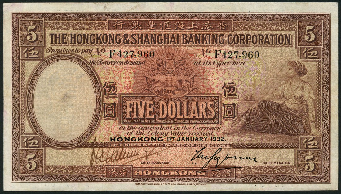 (x) Hong Kong and Shanghai Banking Corporation, $5, 1 January 1932, serial number F 427960, brown and multicoloured, maiden at right, arms top centre, manuscript signature low left, printed signature of Greyburn low right, reverse brown, bank building and angel