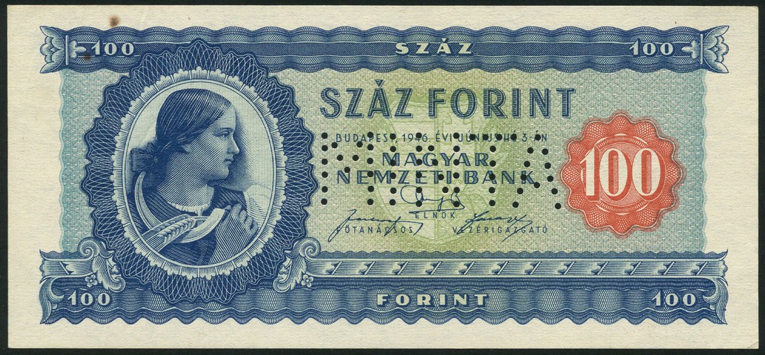 (†) Magyar Nemzeti Bank, specimen 100 Forint, 3 June 1946, serial number B 000 000000, blue, red and green, woman holding sickle at left, reverse hands grasping hammer and wheat; also a group of specimens, 27 February 1947, comprising 10 Forint, serial number A 000 000000, green, Petofi at right, 20 Forint, serial number C 000 000072, blue, Dozsa at right, 100 Forint, serial number B 000 000110, deep rose-red, Kossuth at right, all perforated MINTA