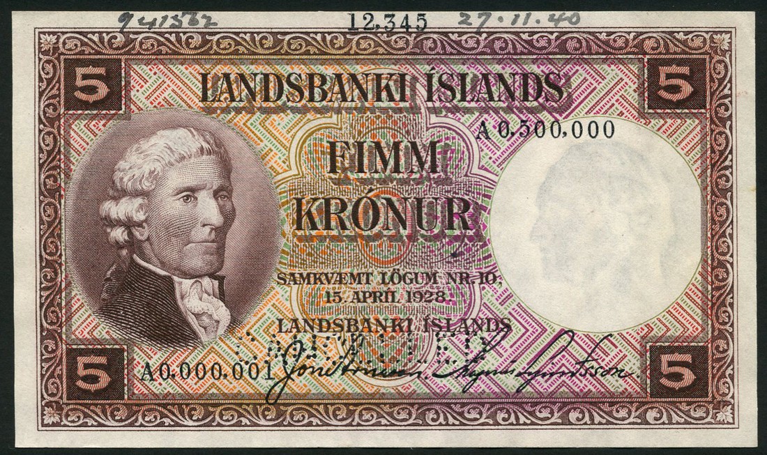 (†) Landsbanki Islands, printers archival specimen 5 kronur, L.1928, first issue, serial number range A0.000,001 - A0.500,000, brown and violet on orange, green and brown underprint, J. Eriksson at left, value at each corner, reverse brown, bank building at right, peforated CANCELLED
