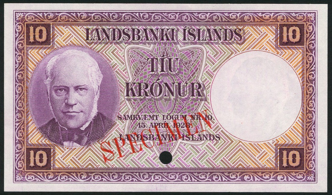 (†) Landsbanki Islands, colour trial 10 kronur, L.1928, purple on multicolour underprint, J. Sigurdsson at left, value at each corner, reverse purple, waterfall at right, one cancellation hole, red SPECIMEN overprint