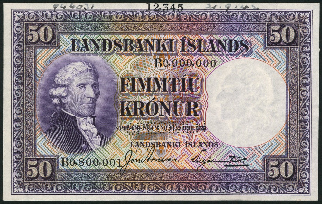 (†) Landsbanki Islands, printers archival specimen 50 kronur, L.1928, first issue, serial number range B0.800,001 - B0.900,000, violet on multicolour underprint, J. Eriksson at left, value at each corner, reverse violet, freighter and fishing boats at right, perforated SPECIMEN