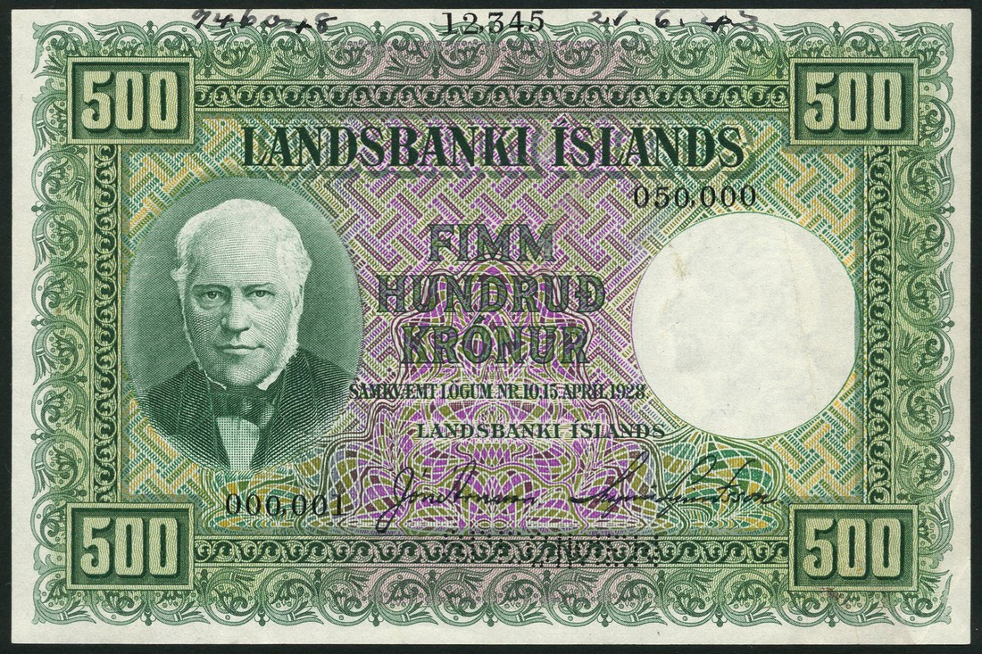 (†) Landsbanki Islands, printers archival specimen 500 kronur, L.1928, first issue, serial number range 000,001 - 050,000, green on multicolour underprint, J. Sigurdsson at left, value at each corner, reverse green, rock shelf and river at right, perforated SPECIMEN