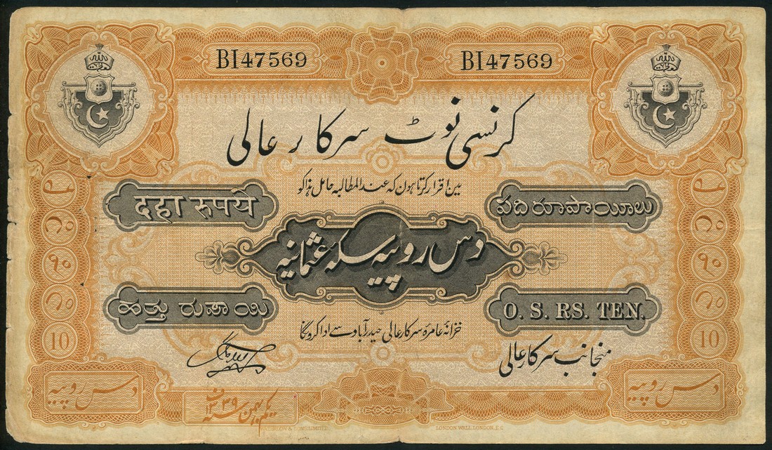 Hyderabad Government issue, 10 rupees, ND (1918), serial number BI 47569, black and orange-brown, arms top left and right