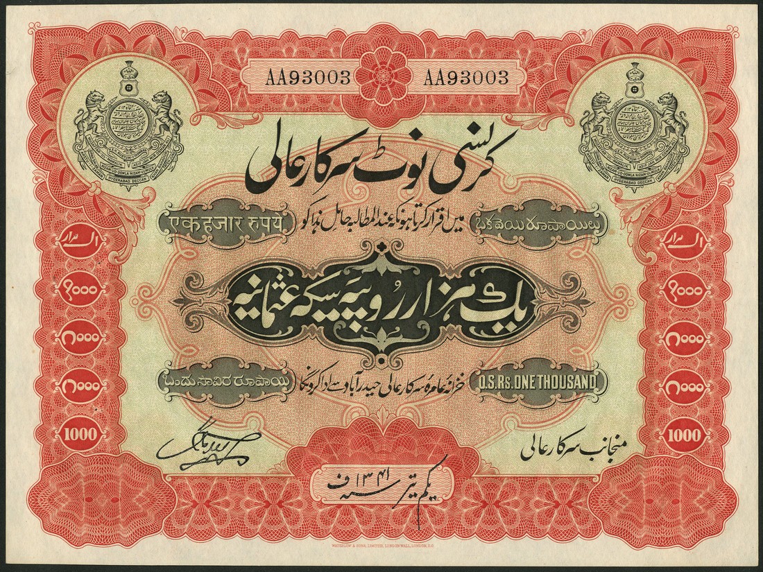 (x) Hyderabad Government Issue, 1000 Rupees, FE 1341 (1930), serial number AA93003, red and black on light green underprint, arms upper left and right, value left and right, reverse value in oval at centre and in four corners