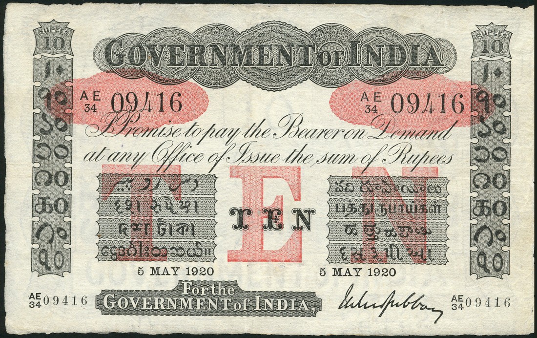 Government of India, 10 rupees, 5 May 1920, serial number AE/34 09416, black and white with value in pink underprint at centre, Gubbay signature, also 5 rupees, 2 December 1918, prefix ND/73, as previous