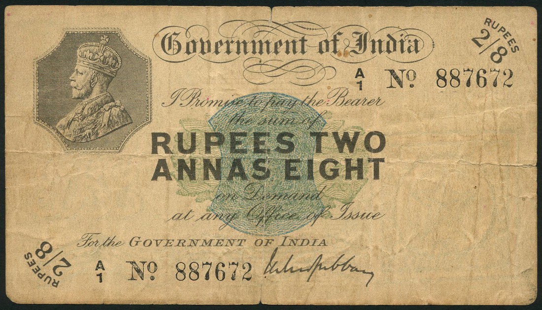 Government of India, 2 rupees 8 annas, Cawnpore, ND (1918), serial number A/1 887672, black and white with a green central guilloche, head of George V top left, Gubbay signature