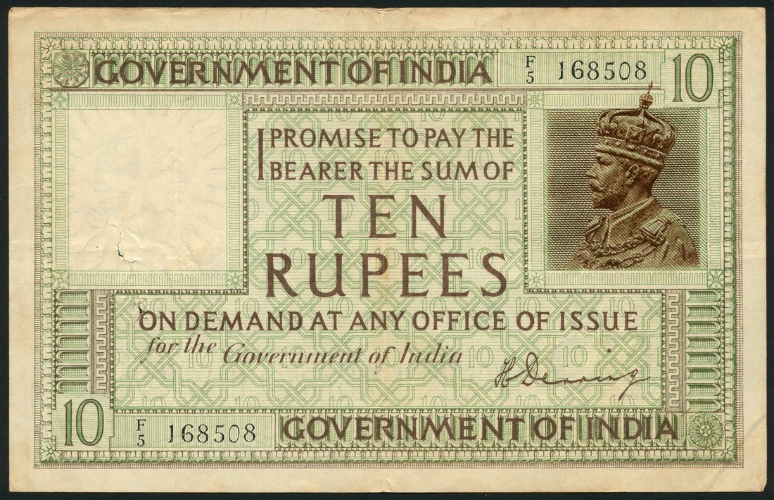 Government of India, 1 rupee, ND (1917), prefix F/37, Gubbay signature, 5 rupees, ND (1925), Denning signature, also 10 rupees, ND (1925), Denning signature, all George V portrait
