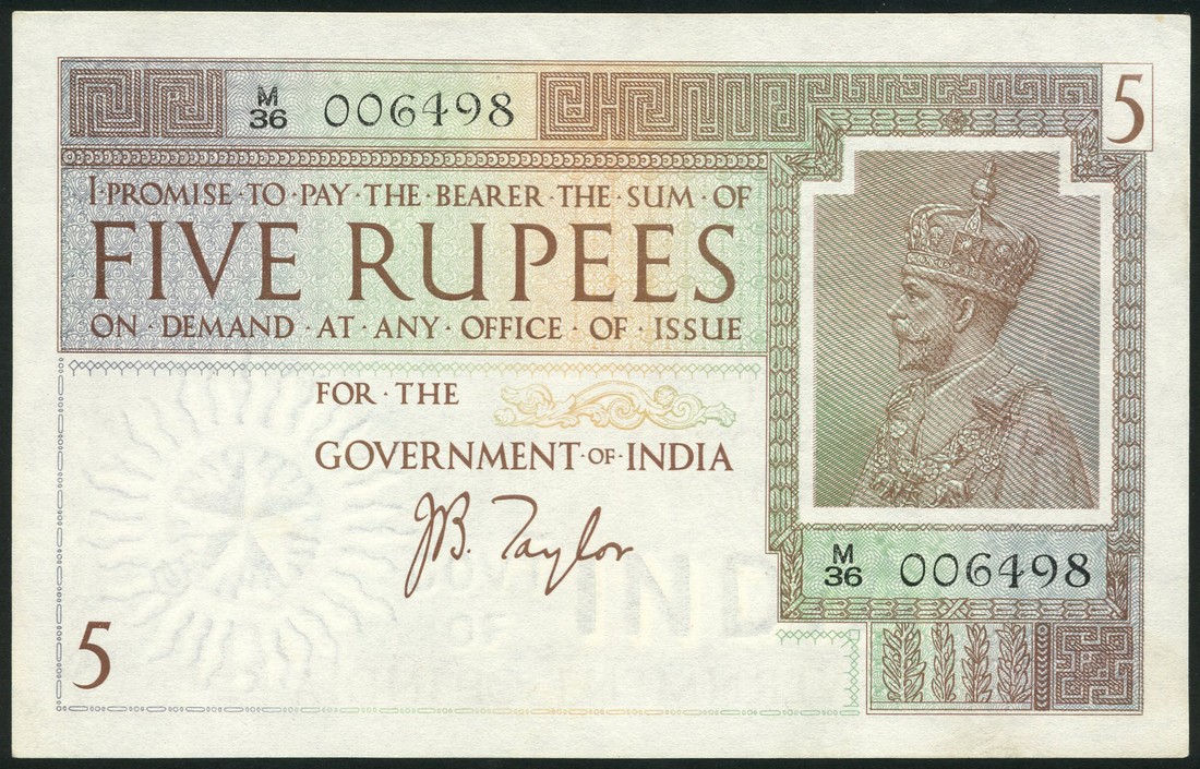 (x) Government of India, 5 rupees, ND (1917-1930), serial number M/36 006498, purple, white, green and orange, George V at too right, Taylor signature