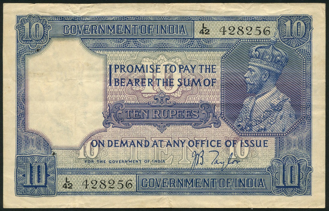 Government of India, 10 rupees, ND (1925), serial number L/42 428256, blue and white, green and lilac, bust of George V top right, Taylor signature