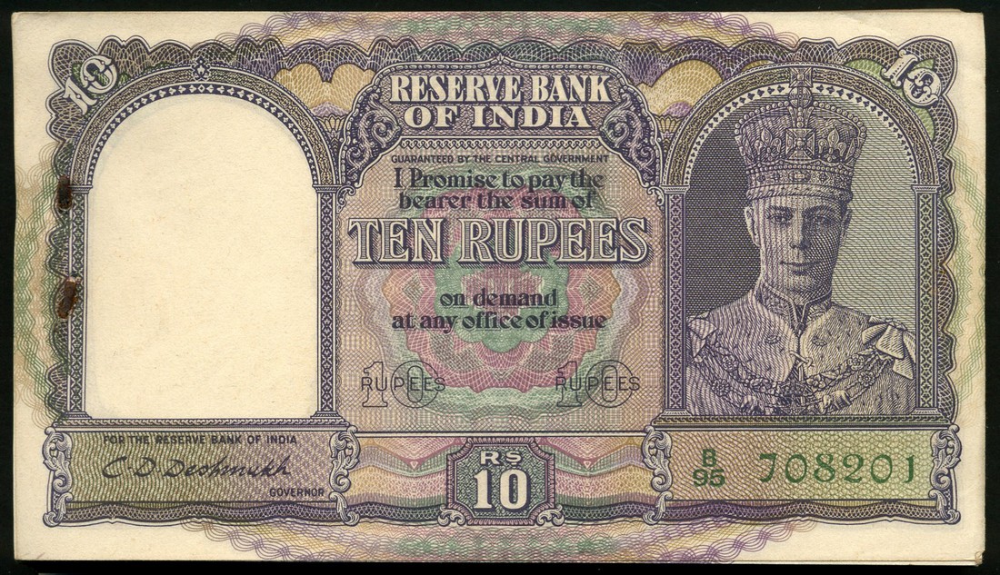 (x) Reserve Bank of India, a bundle of 10 rupees (100), ND (1943), serial range B/95 708201-300, purple on multicolour underprint, George VI at right, reverse sailing boat