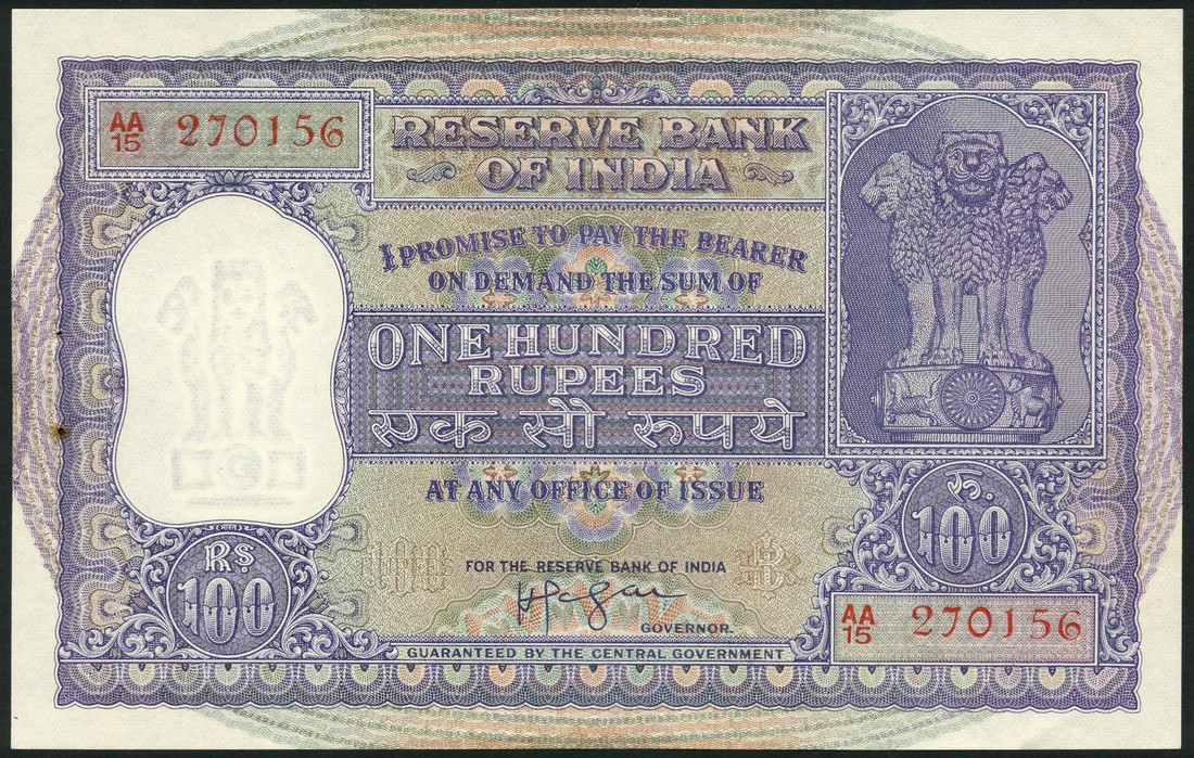(x) Reserve Bank of India, 100 rupees, ND (1957-62), serial number AA/15 270156, purple on multicolour underprint, Asoka Column at right