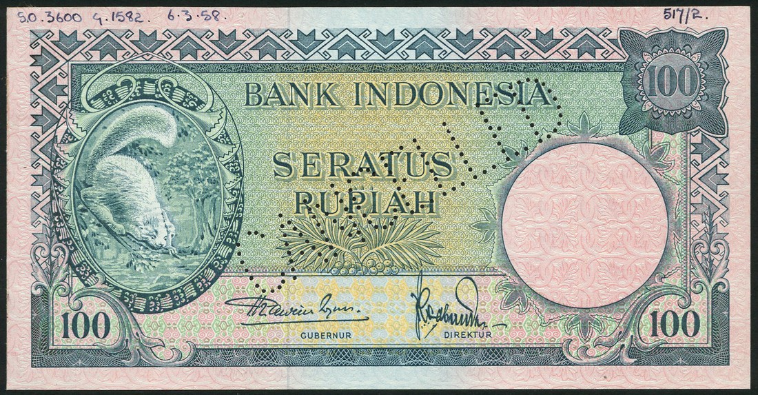 (†) Bank Indonesia, specimen 5 Rupiah, 1952, serial number 5RBQ 000000, grey-blue and blue-green, Raden Adjeng Kartini at left, two birds at top centre, value in three corners, reverse grey-blue and brown, stylised snakes and branches; also 100 Rupiah, ND (1957), serial number 100AAA00000, grey-blue and green on pink underprint, squirrel at left, reverse red, presidential palace, perforated CANCELLED