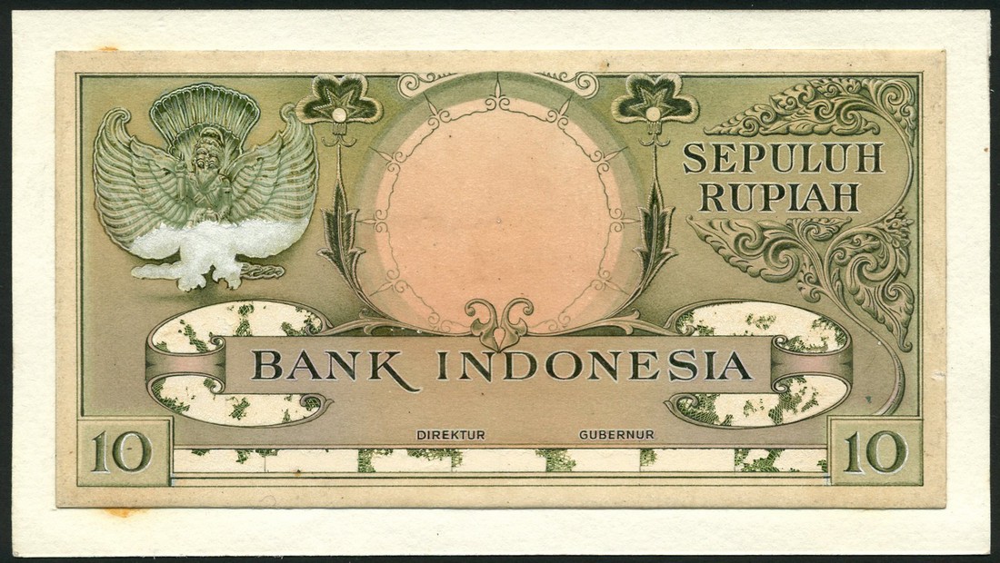(†) Bank Indonesia, an obverse composite essay on card for a 10 Rupiah, ND (ca 1957), olive-green and brown on orange underprint, winged garuda at upper left, value in words set in acanthus leaves at upper right, value in figures at lower left and right