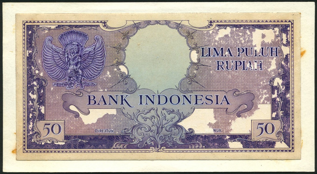 (†) Bank Indonesia, an obverse composite essay on card for a 50 Rupiah, ND (ca 1957), violet and purple on blue-green underprint, winged garuda at upper left, value in words at upper right, value in figures at lower left and right