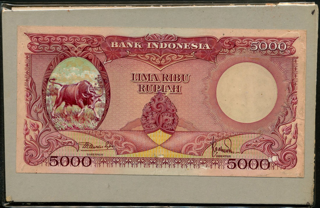 (†) Bank Indonesia, an obverse and reverse composite essay on card for a 5000 Rupiah, ND (ca 1957), serial number 5000 AA 0000, purple and multicoloured, wild buffalo in oval at left, acanthus leaved scrolls at lower left and right, reverse deep blue-green on pink underprint, ship with tug in harbour