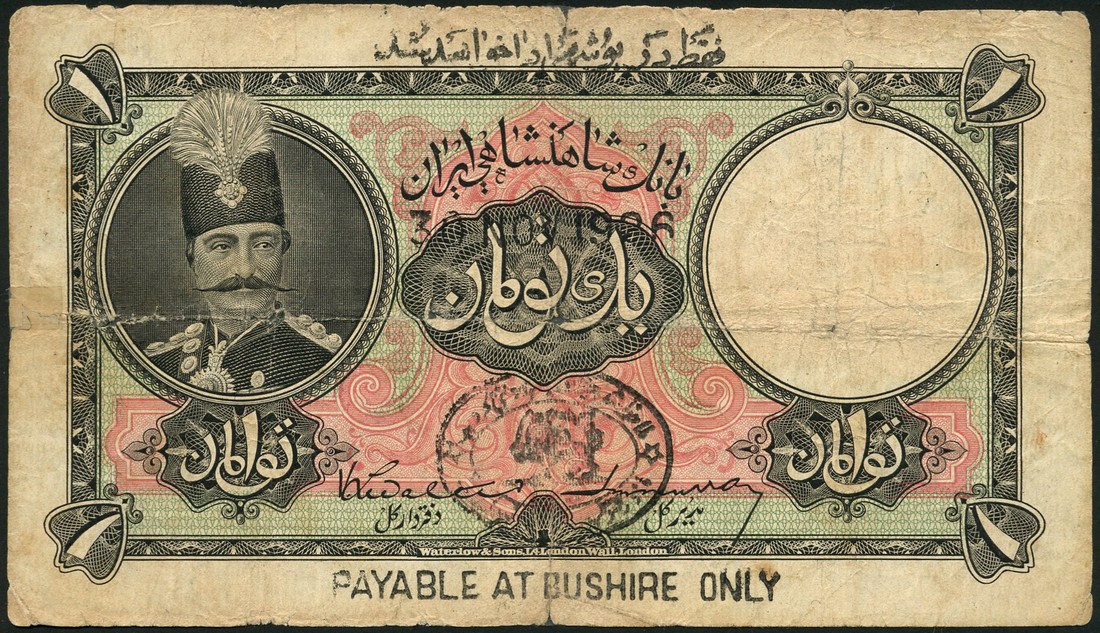 (x) Imperial Bank of Persia, 1 toman, Bushire, 30 November 1926, serial number A/Y 019875, black, pink and green, Shah Muzaffar-al-Din at top left, handstamped date and BUSHIRE, reverse green and pink