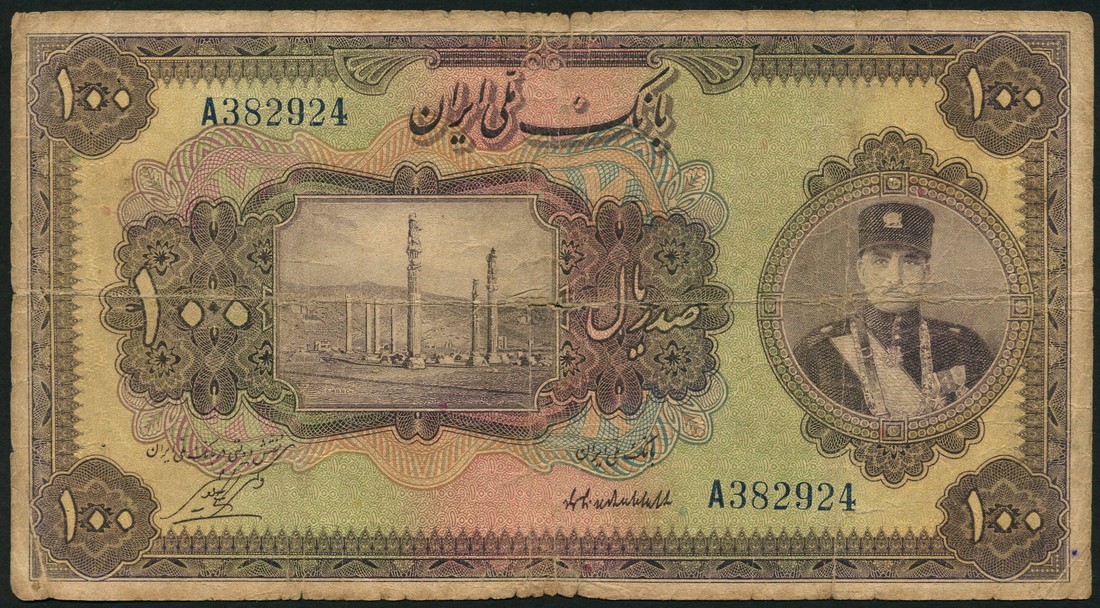 Bank Melli, Iran, 100 rials, AH 1311 (1922), blue serial number A 382924, purple and multicoloured, Shah Reza at right, the ruins at Persepolis at left