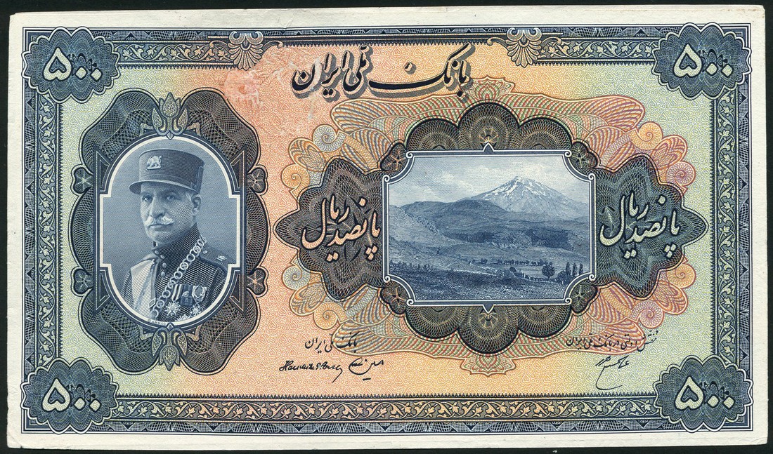 (x) Bank Melli Iran, proof 500 rials, type of 1934, no serial numbers, blue and multicoloured, Shah Reza at left in military cap at left, Mount Damavand in panel at right centre, value at each corner, reverse blue and white, arms at centre, value at centre and at each corner