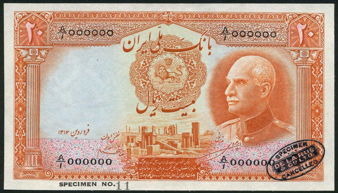 (x) Bank Melli, Iran, specimen/trial 20 rials, AH1316 (1937), serial number A/1 000000, orange, lilac and pale blue, Shah Reza facing at right, ruins low centre, column at left and right, reverse orange, a series of bridges across a valley at centre, French text