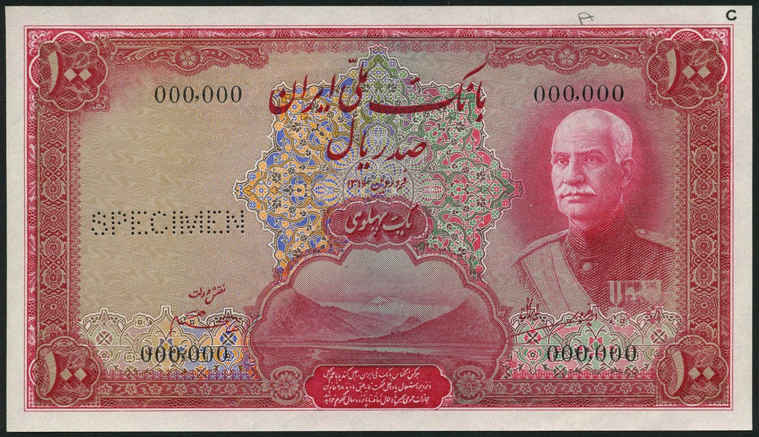 (†) Bank Melli Iran, colour trial 100 rials, AH 1316 (1937), zero serial numbers, red and pale blue and multicoloured, Shah Reza in military uniform at right, Mount Damavand low centre, reverse red and pale green, fortress at centre, arms in square frame at left, text in French