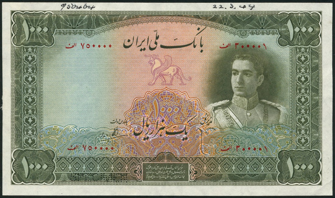 (†) Bank Melli Iran, specimen 1000 rials, ND (1944), red serial number 30001-75000, green and multicoloured, Shah Pahlavi at right, value at each corner, reverse green, Mount Damavand at centre