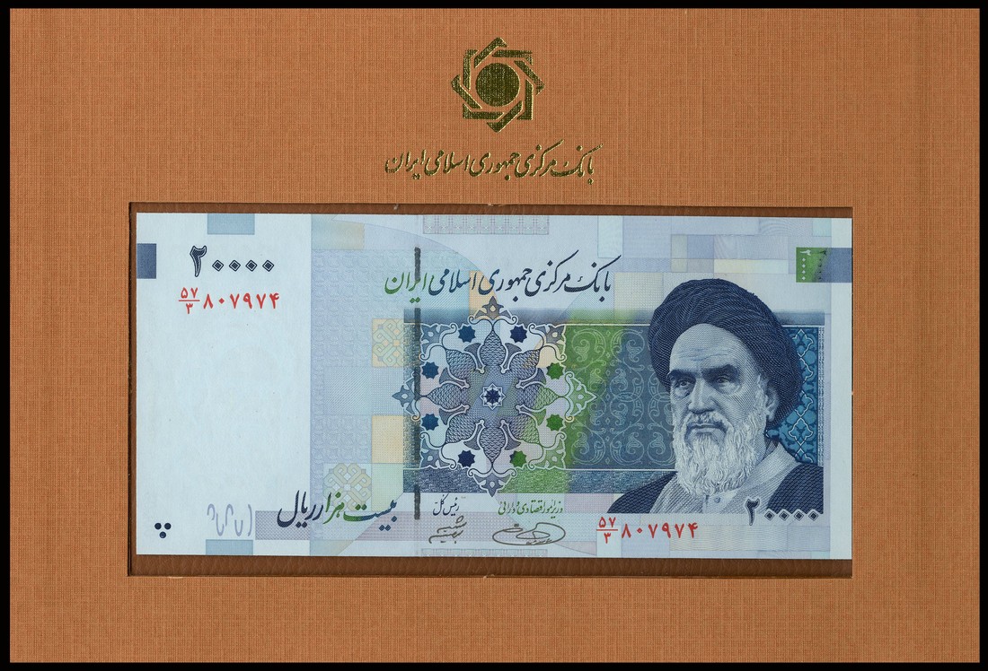 Central Bank of the Islamic Republic of Iran, a presentation album in tan leather with embossed title, the notes in cloth frames within album, 100, 200,500, 1000, 2000, 5000, 10000 and 20000 rials, signature 28, 31, 28, 27, 33, 28, 28 ,31 respectively, note with detailed descrptions in pocket at end of album, a wonderful item