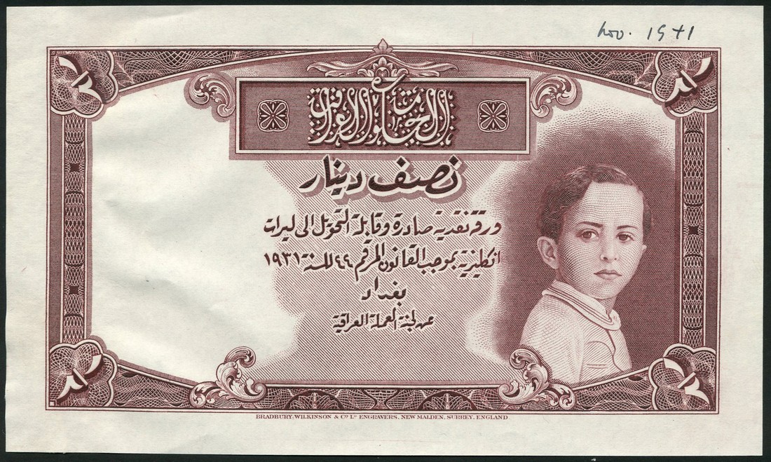 (†) Government of Iraq, a die proof uniface partial obverse for a 1/2 dinar, law of 1931 (1941, issued in 1942), brown and white, King Faisal II as a child at right, value at each corner, no signatures