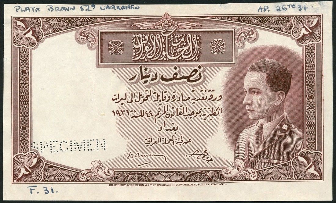 (†) Government of Iraq, a die proof uniface partial obverse for a 1/2 dinar, law of 1931 (1934, issued in 1935), brown and white, King Ghazi at right, value at each corner, Amery and al-Askari signatures, also a uniface partial reverse in brown and white, brown and white, bank title and value, also three background colour die proofs