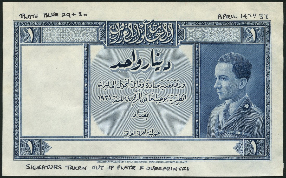 (†) Government of Iraq, a die proof uniface partial obverse for a 1 dinar, law of 1931 (1937, issued in 1935), blue and white, King Ghazi at right, value at each corner, no signatures, also a uniface partial reverse in blue and white, bank title and value