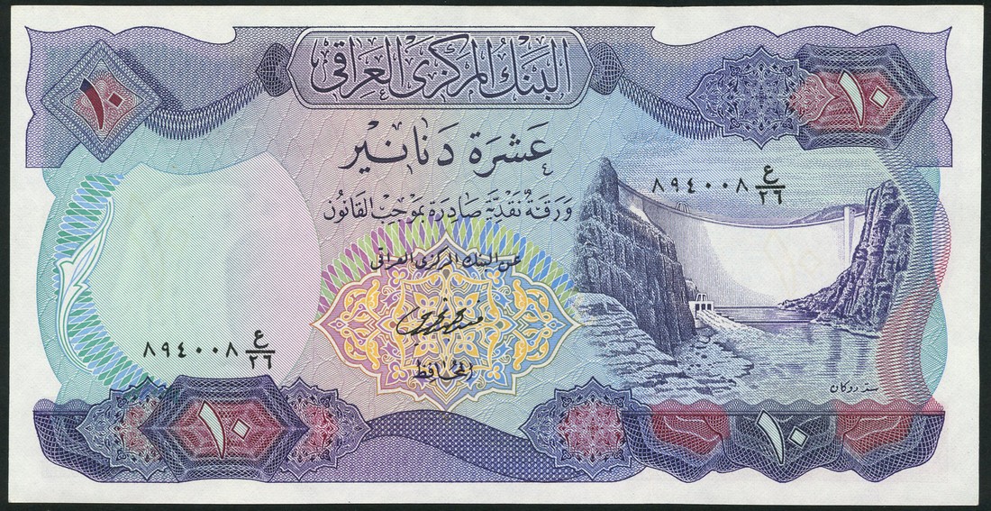 (x) Central Bank of Iraq, a partial set of the ND (1973) issue comprising 1/4 dinar, blue-grey, 1/2 dinar, brown-purple, 1 dinar, blue, 5 dinars, purple, 10 dinars, purple, all al-Kaissi signature except the the 5 dinar Abdul Zalzalah