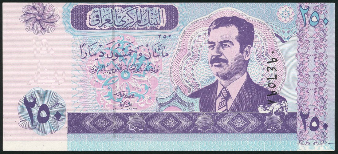 Central Bank of Iraq, 250 dinars error note (2), mauve, turquoise and pale pink, one with serial number at right, the other at left, reverse has been overprinted, very unusual