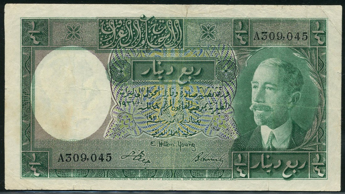 (x) Government of Iraq, 1/4 dinar, 1 July 1931 , serial numbers A 309045, green and multicoloured, King Faisal I at right, value at each corner, Hilton Young and Hornsby signatures low centre, reverse green and white, value in field