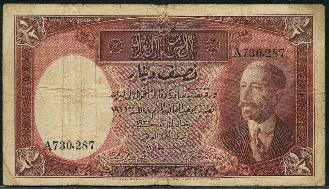 (x) Government of Iraq, 1/2 dinar, 1 July 1931 , serial numbers A 730287, brown and multicoloured, King Faisal I at right, value at each corner, Goschen, Afnan and Amery signatures low centre, reverse brown and white, value in field