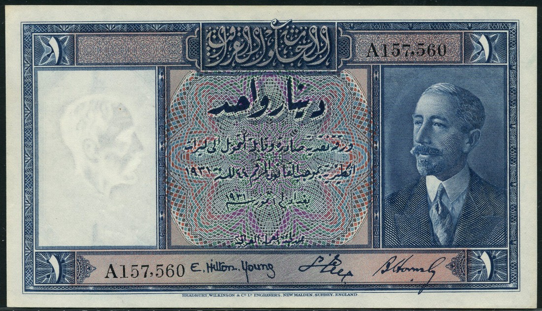 (x) Government of Iraq, 1 dinar, 1 July 1931 , serial numbers A 157560, blue and multicoloured, King Faisal I at right, value at each corner, Hilton Young, al Askari and Hornsby signatures low centre, reverse blue and white, value in field