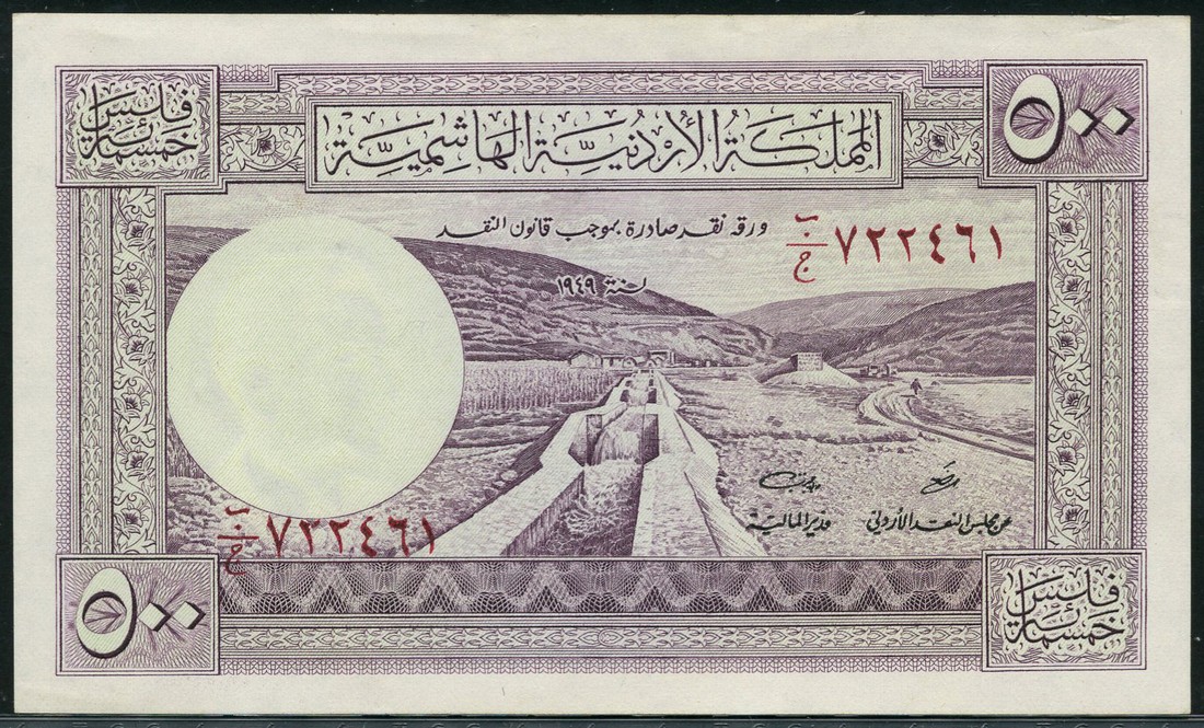 Hashemite Kingdom of Jordan, 500 fils, ND (L 1949), serial number B/C 722461, lilac, landscape with irrigation system, reverse cattle in hayfield