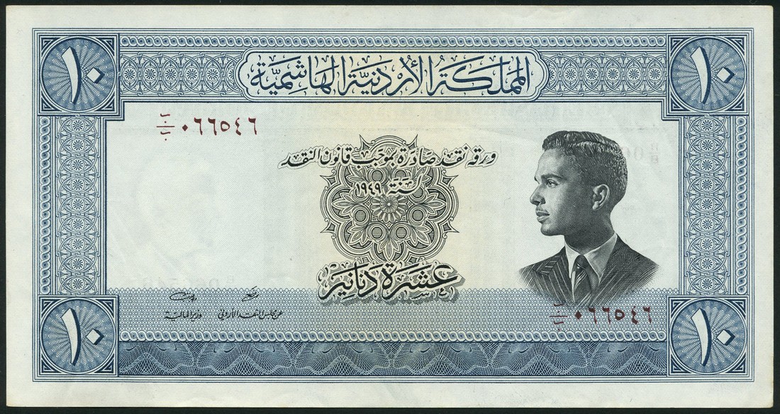 Hashemite Kingdom of Jordan, 10 dinars, 1949, serial number B/B 066546, blue and black, King Hussein at right, reverse El Hazne, Treasury of Pharoah at Petra centre