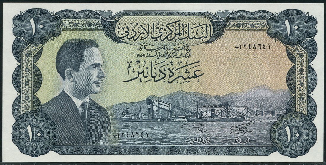 Central Bank of Jordan, 10 dinars, ND (1965), serial number 248641, blue grey on multicolour underprint, King Hussein at left, reverse blue grey, Baptismal site on River Jordan