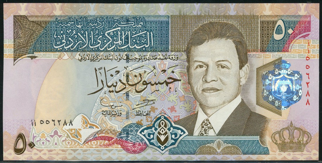 Central Bank of Jordan, group of notes comprising 5 dinars, 1992, serial number 201710, 10 dinars, 1992, serial number 069101, 20 dinars, 1992, serial number 207919, 50 dinars, 1999, serial number 556288