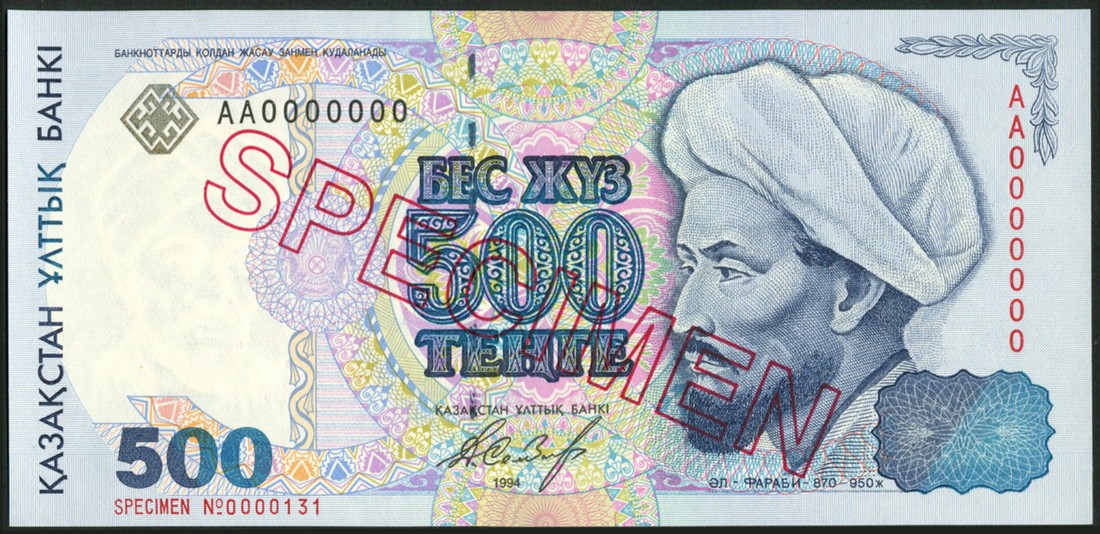 (x) National Bank of Kazakhstan a specimen set of the 1993 issue comprising 1, 3, 5, 10, 20, 50, 100 and 500 tenge, all serial number AA0000000, multicoloured, figures and places of national importance on obverse and reverse