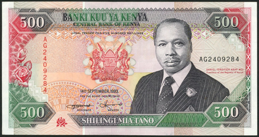 (x) Central Bank of Kenya, 50 shillings, 1 July 1971, serial number A/8123600, brown on multicolour underprint, portrait of Mzee Kenyatta at left, obverse, rural scene, 500 shillings, 14 September 1993, serial number AG2409284, 500 shillings, 1 July 1995, serial number AB5783332, the latter two with portrait of Daniel Arap Moi at right and centre left respectively, obverse parliament building