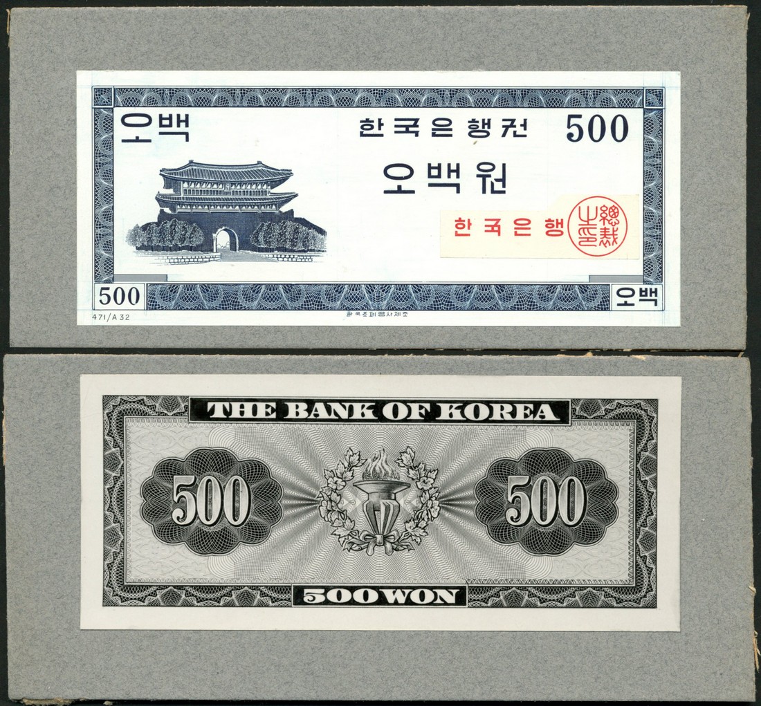 (†) Bank of Korea, a composite obverse stage essay on board, 500 Won, ND (1962), no serial numbers, dark green, black and red, pagoda gateway at left, value in each corner; also a black and white photographic style reverse proof for the same note, mounted on board, torch at centre, value at left and right