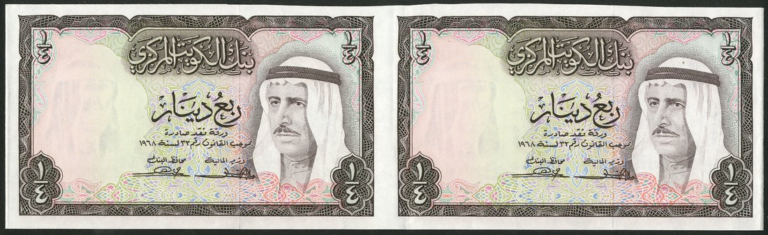(x) Central Bank of Kuwait, an uncut pair of 1/4 dinars, ND (law of 1968), no serial numbers, brown and multicoloured, Amir Shaikh Sabah at right